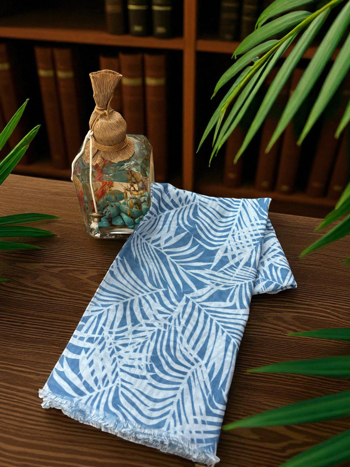 Hediyelik Firuze Serisi Düz Desenli Şallar %100 Pamuk Tropik Desen Mavi