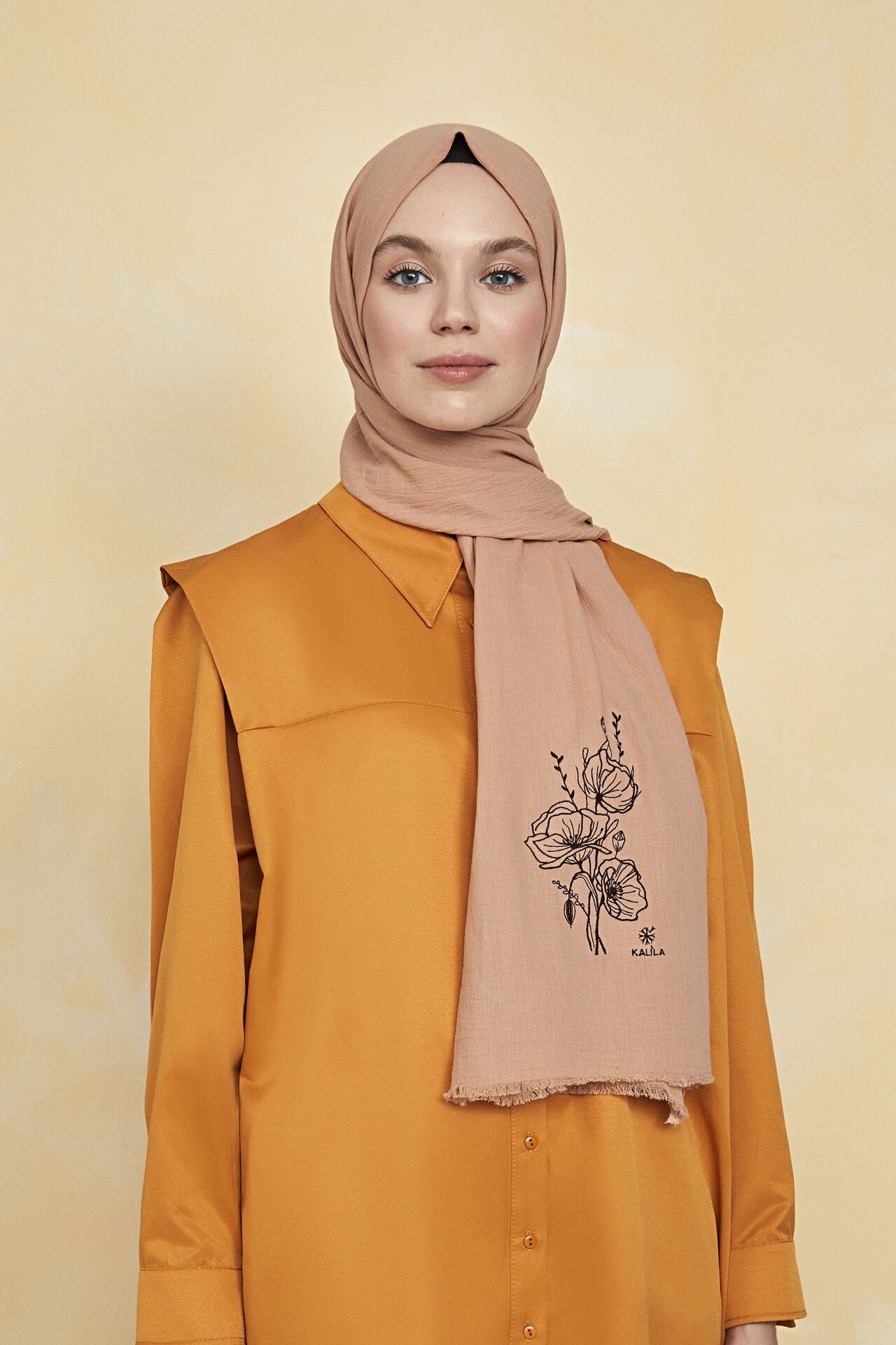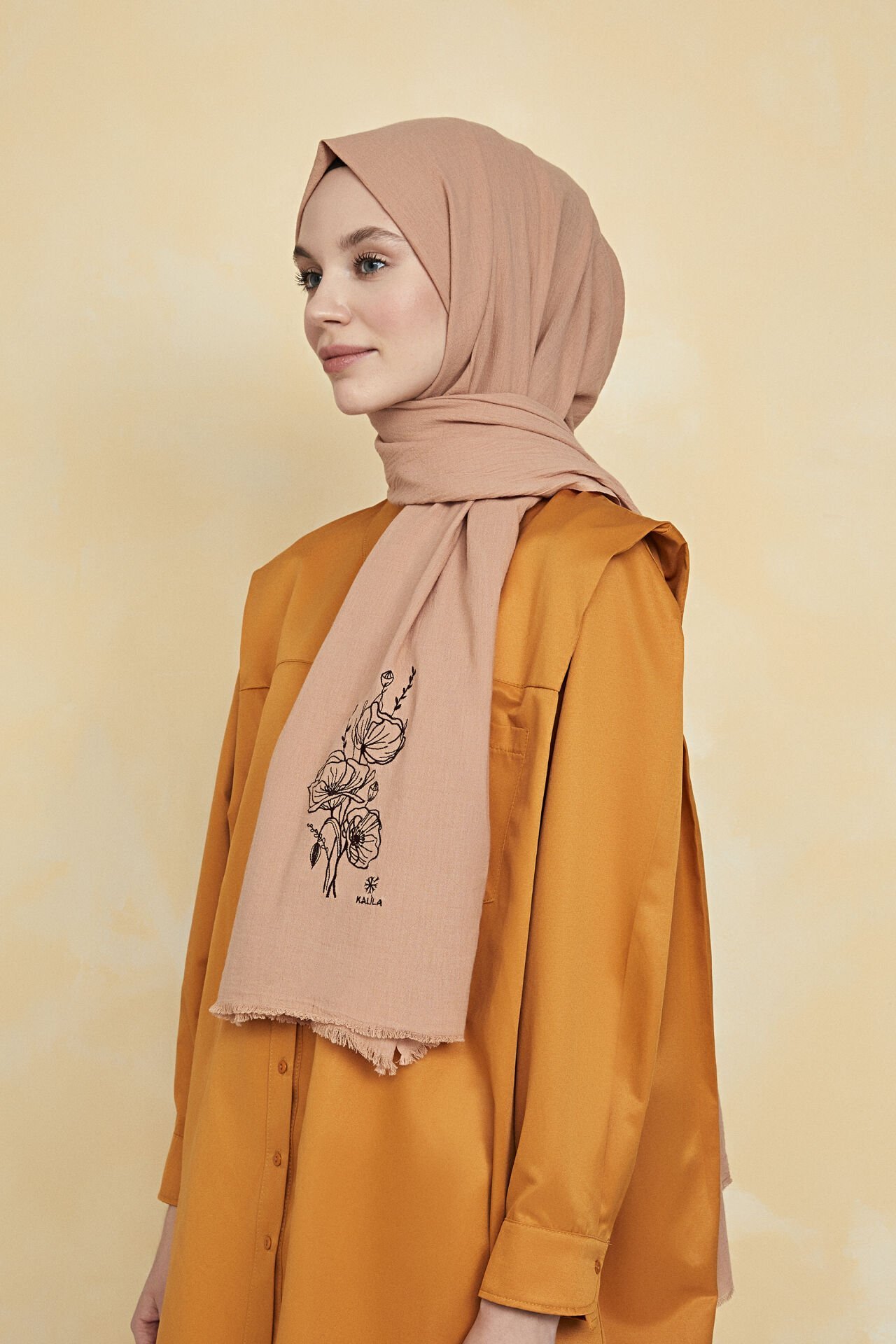 Organik Boyalı %100 Pamuk Şal Sütlü Kahve Doğa Gelincik Nakışlı