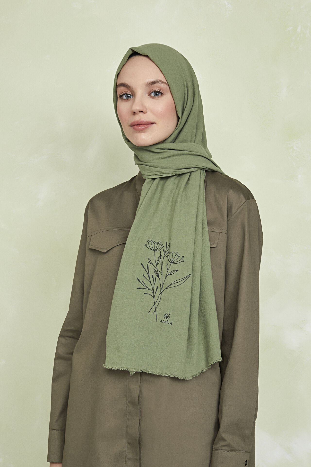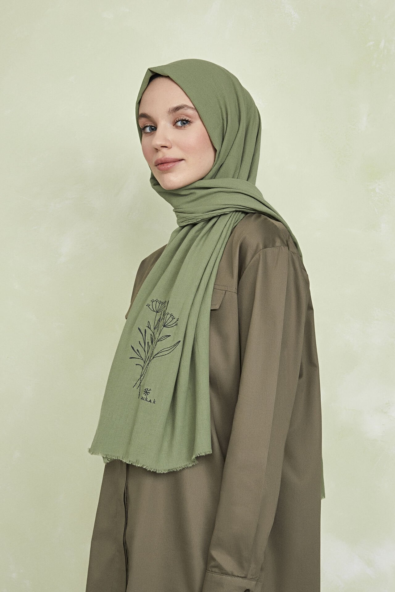 Organik Boyalı %100 Pamuk Şal Yeşil Doğa Nakışlı